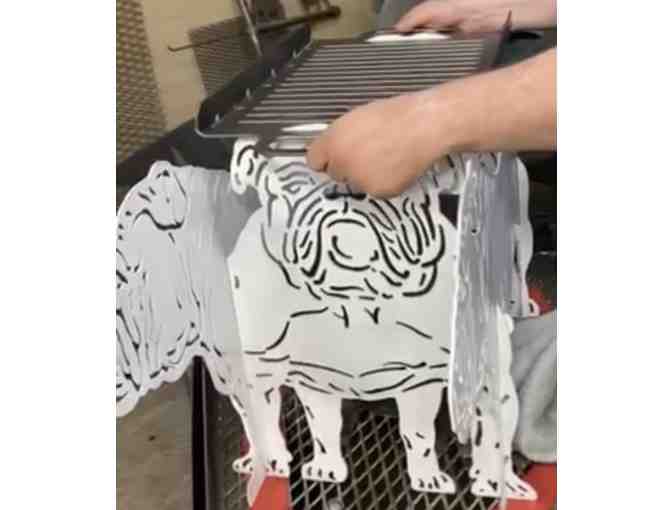 This Bulldog fire pit/grill is a piece made available by Mark Mullen. Mark is a welder who has been happily owned by bulldogs for nearly 24 years. This pit that is donated is black in color, and simply interlocks together. It is shipped flat and can be used as a fire pit, or can be cooked on as well, so it’s also portable. It’s made out of heavy steel and is very durable. The drawing which inspired this piece is actually from a photo of his dog Augie!