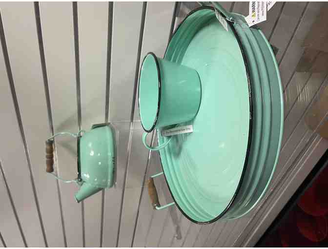 Metal tray, large metal cup and teapot in mint green color with black trim and wood handles