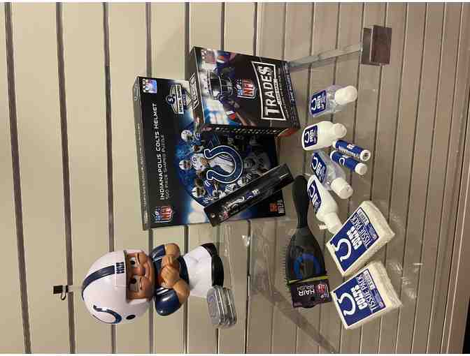 Colts package includes colts player water bottle, Colts 500 pc. Helmet shaped puzzle, Trade$ card game, hand sanitizers, lip balms, hand lotions, mints, tissues, brush and pen.