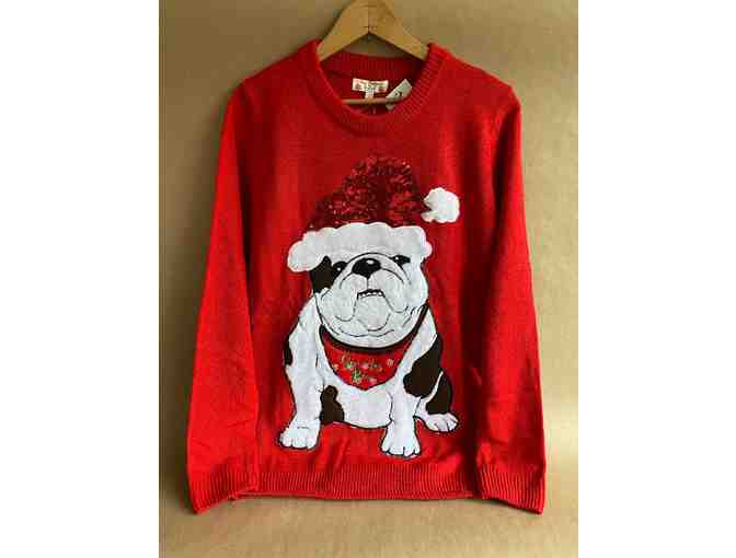 This is the place to come for the best Bulldog Xmas sweaters! And this one is a beauty. From one of our favorite shops, TJMaxx comes this beautiful bullie who is ready to pawty! And with just the right amount of sequins on his hat, he is a must have!