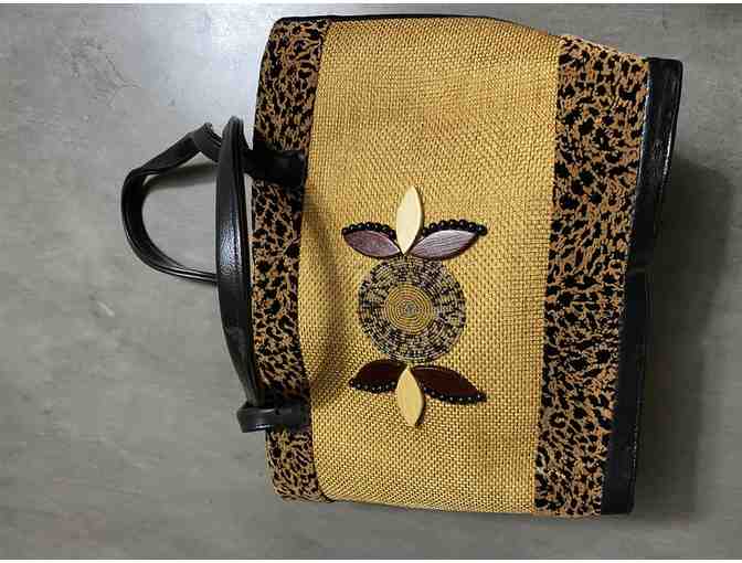 This sturdy purse closes with a zipper and is lined inside. It can be worn over the shoulder or carried by its straps.