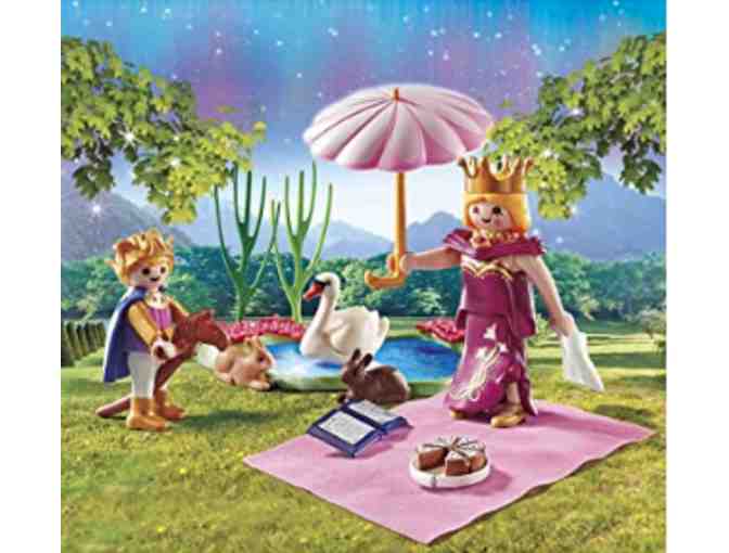 The Queen enjoys sitting by the lake with her son, the prince, as they enjoy some delicious cake. Set includes one adult figure, one child figure, lake setting, parasol, picnic blanket, rabbits, swan, and other accessories. Combine this set with the PLAYMOBIL Starter Pack Princess Castle (#70500 - sold separately) for even more royal fun. Recommended for ages 3 years and up. Warning. Choking Hazard. Small parts. Not for children under 3 years.