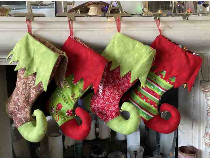 Brighten up your fireplace with these one of a kind, handmade stockings. Stockings are made from cotton flannel and lined with cotton Xmas fabric. The toe is stuffed with a jingle bell sewn onto the toe to alert if anyone is trying to sneak a peek at their stocking goodies. A ribbon loop completes the look to allow for hanging. A perfect gift for more whimiscal Xmas decor! Great for kids.
