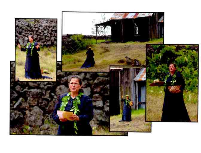 The Kona Historical Society comissioned playwright Victoria Nalani Kneubuhl to script a living history of Ms. Bird's impressions of Kona that was performed by Professor Emerita Jackie Pualani Johnson over the course of nearly ten years. Ka'anahaha and Kealapuali, sites where Ms. Bird horsebacked to witness Mauna Kea, Mauna Loa, and Hualalai in all their glory, were revisted for the performances. Where sheep stations once provided shelter to the intrepid explorer, audiences settled in on lava rock walls and relived Ms. Bird's adventures in 1873, including exploring heiau and lava stalactites in drippy caves along the slopes of Kona Mauka.