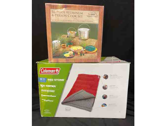 Enjoy the beautiful California outdoors with this great camping package. The 16-piece aluminum cookware set contains all the pots, pans and dishes you need to cook and serve up a yummy open-air meal. Then when the sun goes down snuggle into your warm sleeping bag for a night under the stars. It's a perfect starter package for camping enthusiasts.