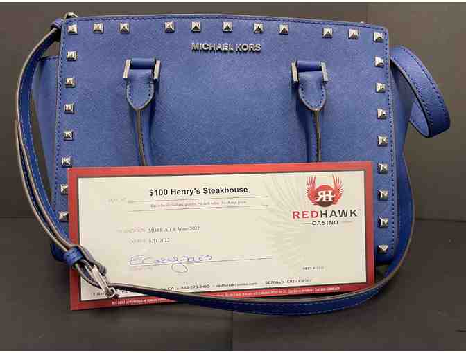Dress it up or dress it down, this beautifully designed Selma Stud Sapphire medium satchel is a perfect accompaniment to anything you wear. This gorgeous Michael Kors handbag, eye-catching from all angles, will get you tons of compliments. Courtesy of Sierra Pacific Industries. And hidden inside this prize is a little something to treat yourself and/or someone special - a $100 gift certificate to the fabulous Henry's Steakhouse, courtesy of Red Hawk Casino. After everything we went through last year, it's time for a little special indulgence! This prize will be awarded to the top two bidders.