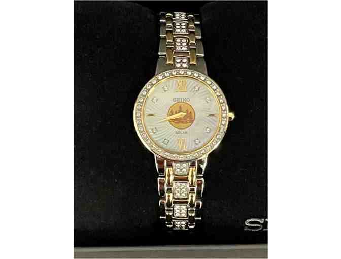 This spectacular ladies' timepiece is designed with a two-tone stainless steel case and bracelet, featuring Swarovski® crystals adorning the bezel bracelet and the mother-of-pearl dial which also includes an inlaid image reflecting our local area. Powered by any light energy, its Solar Cell is energy-efficient with a 12-month power reserve once fully charged. Courtesy of Sierra Pacific Industries, this striking addition to any lady'swrist is a must-have accessory to wear every day. This prize will be awarded to the top two bidders.