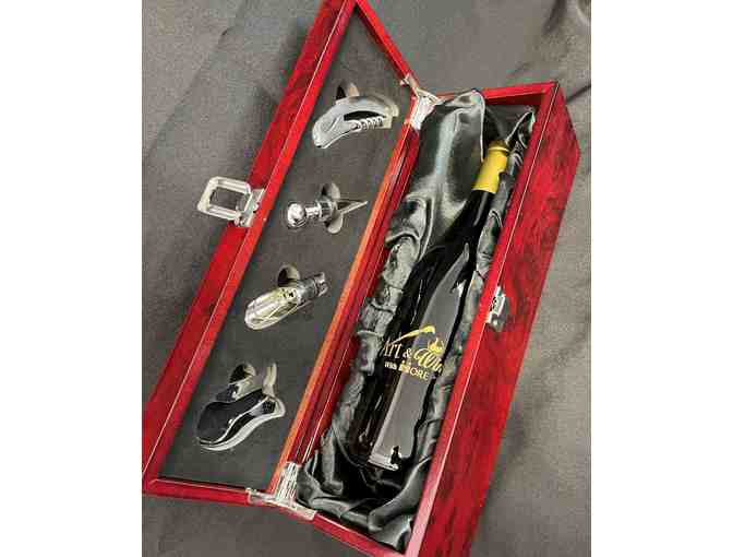 As a tribute to 20 years of the Art & Wine With Something MORE event, Arnolds for Awards graciously created this fabulous prize.  Inside the commemorative box you will find a wonderful red blend bottle of wine with Mourvedre, Grenache and Syrah, beautifully etched with the Art & Wine logo.  The lid encases is a lovely wine tool set including foil cutter, cork screw, a wine pourer and stopper.  Now this is a prize to remember!