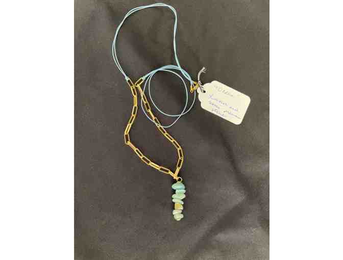 Artisan jewelry by Distinctive Beadwork, handcrafted by Renee. This beautiful gold tone pendant with leather and semi-precious stones will be the perfect accessory for any ensemble you wear. Courtesy of Renee Hargrove.
