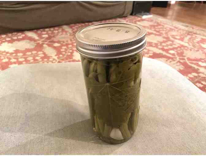 These pickled beans are legendary -- they're the perfect complement for your Bloody Mary. Or you can just eat them like a pickle. These beans are straight-up dilly -- no peppers. The homegrown grape leaf is for crispness. Enjoy!