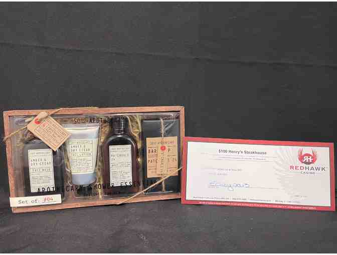 Gentlemen, here's a little something for you to treat a very special someone in your life to a memorable evening. With a SoHo Apothecary gift box full of men's products, you'll be ready to go out on the town and to a fine dinner at Henry's Steakhouse using the $100 gift certificate included in the package. It will, undoubtedly, be an evening to remember!