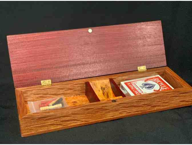 The quality of this handcrafted cribbage board is simply amazing. If you enjoy the fine art of the game of cribbage, you'll certainly enjoy playing it on this fine piece of work by Jack Reid. Complete with a brand-new deck of cards.