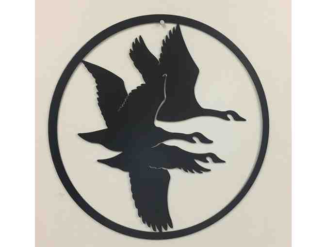 Precision laser cut out of 16 gauge steel, this image of flying Canadian Geese measures 16.5" in diameter. It will be powder painted in black. Both sides are finished so can be reversed.