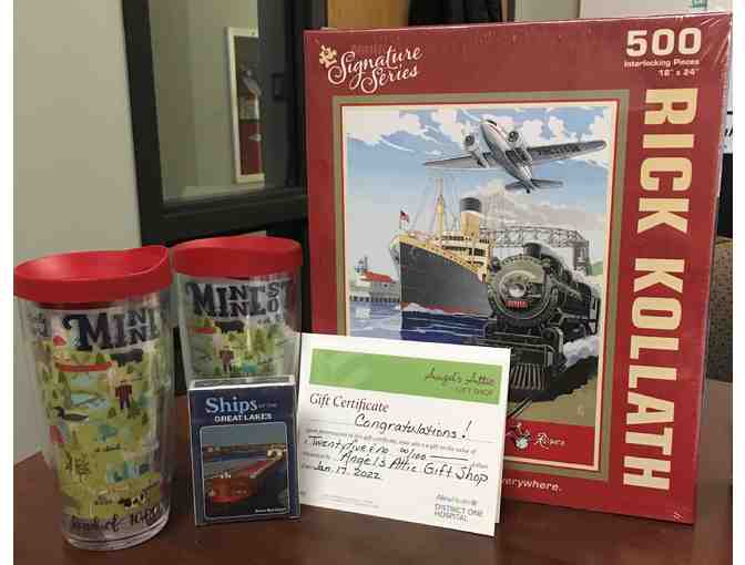 This package includes 2 Minnesota inspired insulated cups, deck of Great Lakes playing cards, a 500 peice puzzle and a $25 gift card to Angel's Attic Gift shop located at District One Hospital-Perfect for a Cozy Night at Home!