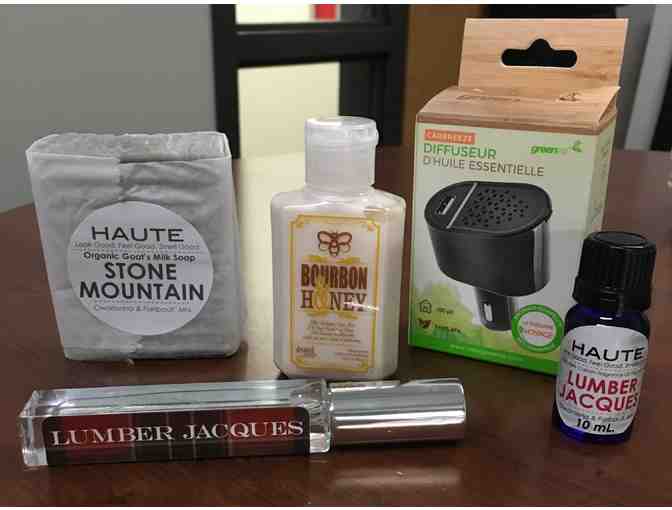 Haute Skin Spa is known for their This package includes Bourbon Honey lotion, Lumber Jacques-Hand crafted clean cologne, Lumber Jacquues car diffuser with fragrance oil and goat milk soap.