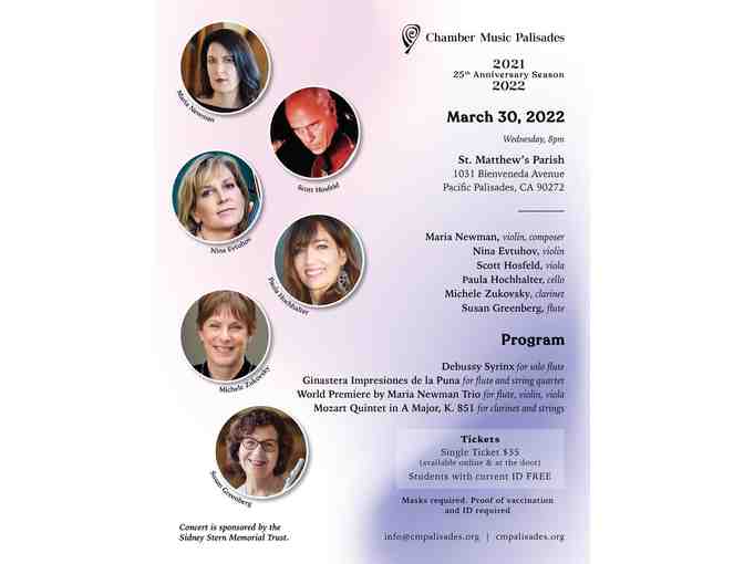 Two (2) tickets to attend the Chamber Music Palisades Concert on Wednesday, March 30, 2022, at 8 pm.