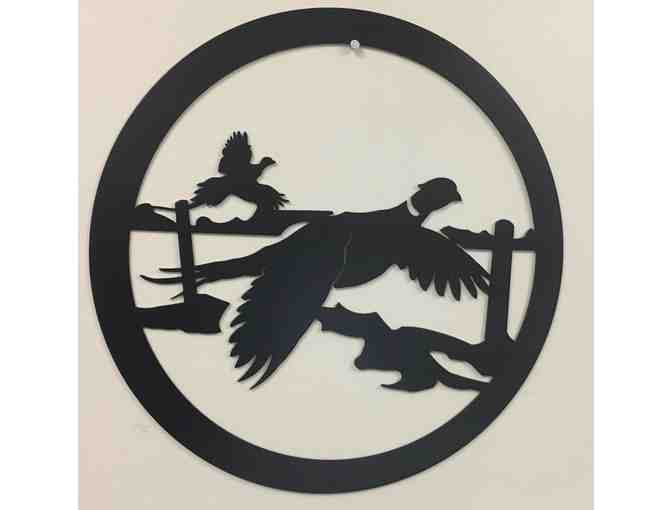 Precision laser cut out of 16 gauge steel, the flying Pheasant image is a great addition for a hunter or wildlife lover. It will be powder painted in black and measures 16" in diameter. Both sides are finished so can be reversed.