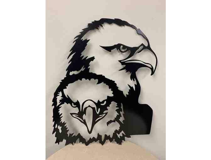 Precision laser cut out of 16 gauge steel, this eagles' heads wall hanging is powder painted in black. Measures 17" high x 14" wide. Both sides are finished so can be reversed.