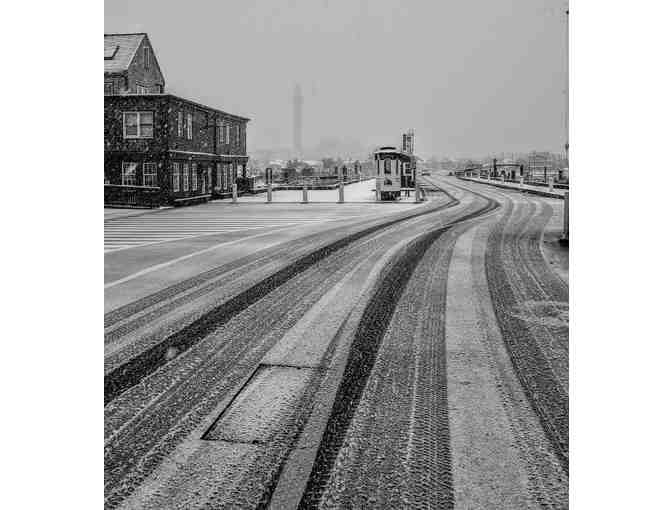 This black & white photograph of "Snowy MacMillan Wharf" is by Jamie Demetriou. The print measures 5"x7" and is finished in a white frame with a white mat. Final size is 8"x10".