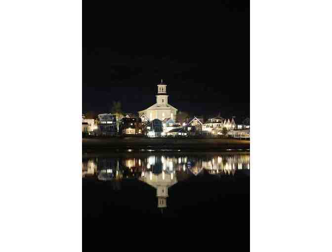 "Nighttime Harbor View of Library" is by Jamie Demetriou. The print measures 5"x7" and is finished in a white frame with a white mat. Final size is 8"x10".