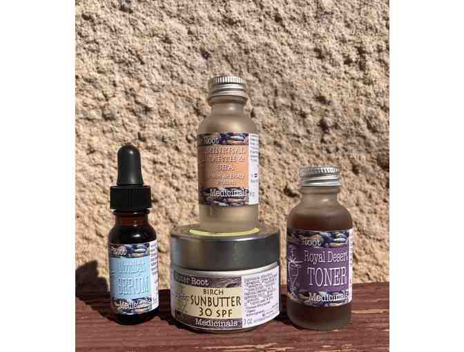 Sister Root's complete facial line has everything you need to care for your face in our sunny dry desert. The Earth, Sea & Mineral Polish provides amazing results and is recommended weekly. The Royal Desert Toner has the perfect pH to balance, tone and tighten and is perfectly paired with the Moonlight Serum for a nightly routine. The Serum is loaded with nourishing Omegas for your face and has the same herbal oil base as Sister Root's best selling Birch Sunbutter - infused with herbs that have been used for abnormal skin cells.
