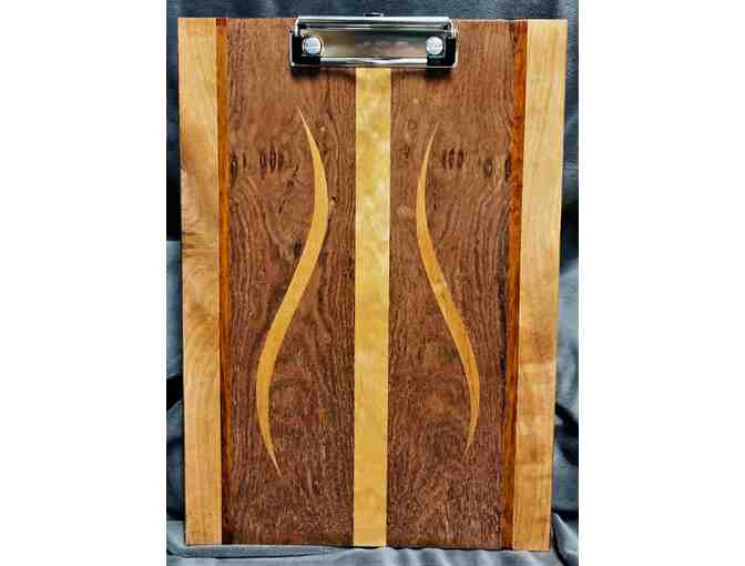 This is the most unique clipboard, worlds away from ordinary clipboards.  Made with a cherry, chechan, bloodwood and maple.  Look closely at the craftsmanship and discover the beautiful inlaid copper.