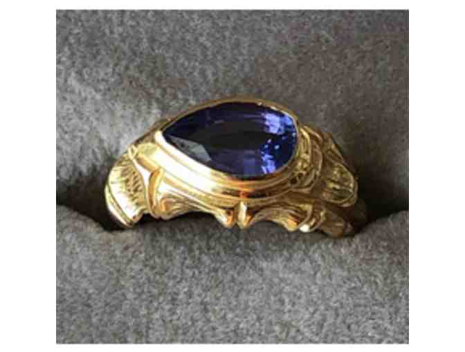 This ring is a ladies 14 kt yellow gold tanzanite ring. The ring contains 1.60 carat faceted pear shape tanzanite that is bezel set. The tanzanite is a high AA quality with medium violet-purple color and good clarity. The band has a unique bamboo look. The ring weighs 6.1 grams.