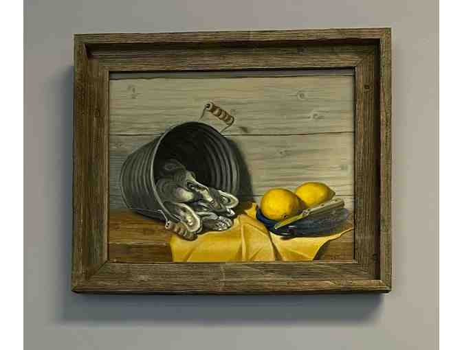 Hang this beautiful Oysters with lemons still life oil painting in your kitchen or outside on your porch. It will inspire you to have an Oyster Roast in your home. The painting measures 11x14 and is enclosed by a beautiful gray barn wood frame.