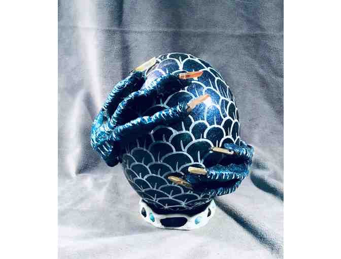 This Ostrich Egg painted to look like a dragon's egg is protected by its mother!  The Dragon's claws are made from quartz crystals. Painted by Nicole Cutler.