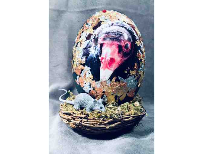 A portrait of the RMRP educational Turkey Vulture ornaments this emu egg in a loving memorial of our Turkey Vulture that served as an Educational Ambassador for 33 years. By artist and former volunteer - Katey Godsey.
