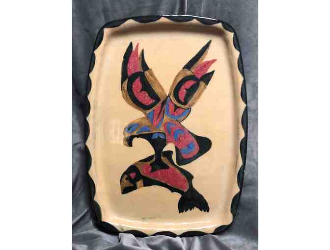 Fishing eagle with salmon.  This platter has a Pacific Northwest motif.  Platter measures 12" x 18" and 1" deep. Artist's name is Vagge.