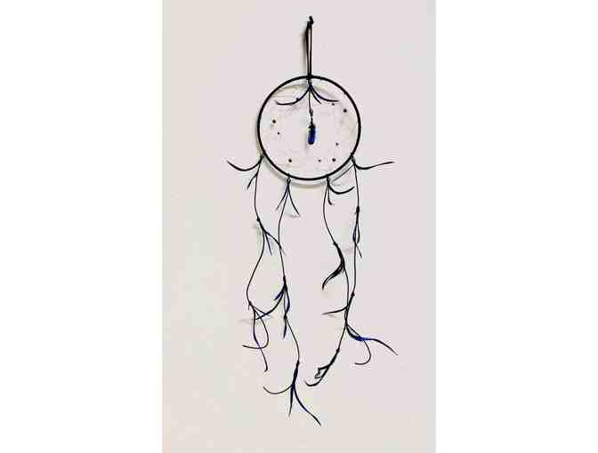 Dreamcatcher ornamented with custom made Silver Hawk Studios hand-carved and painted bison bone feather resembling American Kestrel feather. Accompanied by matching set of Earrings and Necklace. This set of one-of-a-kind feathers were created specifically for this RMRP auction and cannot be purchased in stores. The back of each feather is hand-signed by Silver Hawk, making each one an individual work of art.