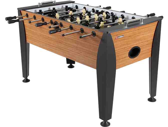 Your kids will enjoy hours of fun with an Atomic Pro Force 56" foosball table! This durable MDF table features rich bamboo laminate, a manual scoring system, built-in ball return, and hollow chrome steel rods with comfortable rubber handles. Assembly required.
