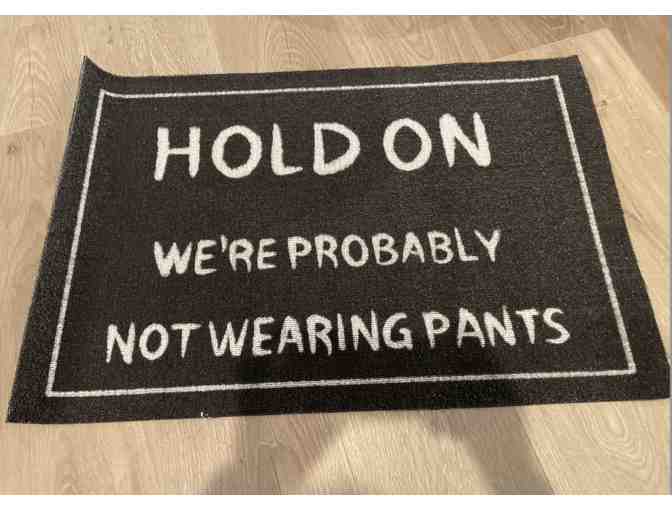 Hold On...We're probably not wearing pants! doormat, Made from a looped vinyl. Durable, latex, non-slip backing. 1/4" thick. Easy to clean, either vacuum or hose off. Wipe clean with soap, water, and a non-abrasive cloth.