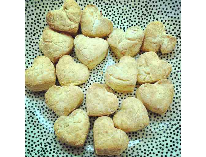 These classic American powder biscuits are made from scratch from a fourth generation family recipe. Fresh high-quality ingredients are mixed, rolled, and hand-cut into 20 large heart shaped biscuits. Will be delivered unbaked and frozen. Simply pop them in the oven at 400 degrees for ten minutes and enjoy warm buttery biscuits on your table. Perfect for a homespun breakfast or savory supper! Delivered on a mutually agreed upon date.