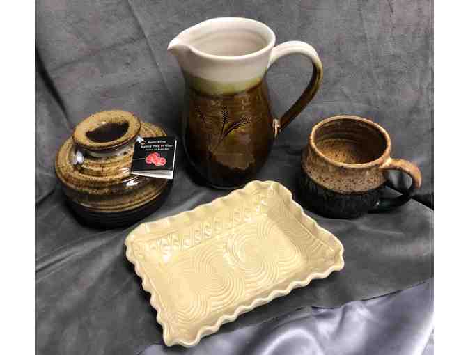 This beautiful collection of pottery - includes pottery plate, butter bell, pitcher, and cup. Made by Kathy Kline, Bev T., and other artists at the Northern Colorado Pottery Guild.