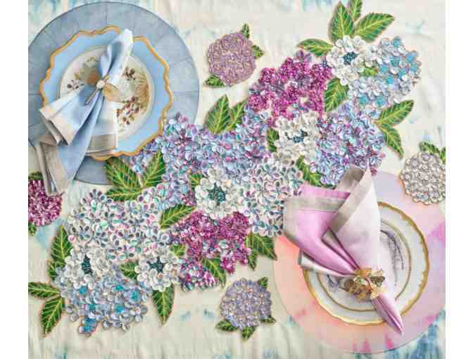 The beaded Hydrangea Table Runner features sequined realistic and fantastical hydrangea, inspired by Kim's Hamptons garden. A unique layering beading technique is applied to achieve the ombre, fluid quality of the petals on this beaded table runner. The flowers on the beaded Hydrangea Table Runner are created by hand using 20-30 different types of sequins and beads.