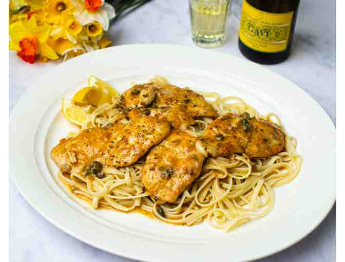Hailing from the northernmost region of Italy, Maria Peracchio Liu's family recipe for chicken piccata is in a class of its own. Her son's Nonno (Grandpa) was raised in Piedmont, Italy, where this dish's bright, lemony sauce was often cooked, albeit with veal. This Italian-American version features chicken instead, and will sit on generous portions of butter-laced linguine. The dish's sauce, consisting of lemon, wine, butter, parsley, and capers, is accented with fresh flavors plucked from the Liu family garden. Prepared to serve eight people on a date agreed to by both parties at least one week in advance.
