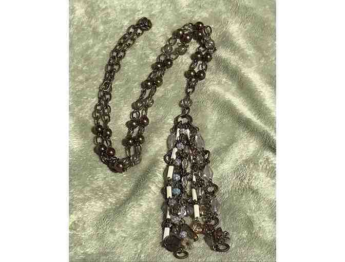 Czech glass beads mounted on lead- free, USA made, Vintaj brand antiqued brass. This neckalce took about 10 hours to make.