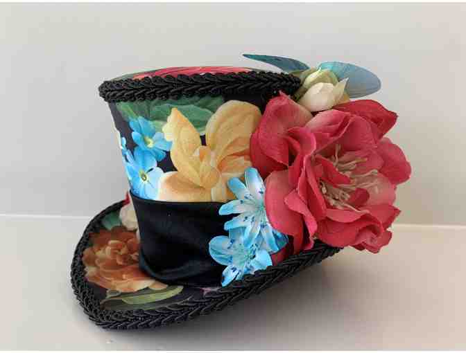 Whether you're headed to the auction gala, the Garden Tea Party or the Kentucky Derby, you cannot go wrong with this incredible mini top hat! Handmade by ChikiBird Hat Studio. Approximately 4 1/2" tall by 6" x 6" wide at the base, with comfortable elastic for easy wearing.