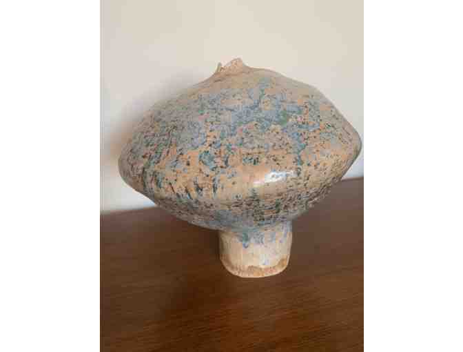 Abstract sculpture, suggestive of a large mushroom, by Randy Robinett. Created last year, this work is hand built (not thrown on a wheel). Though it resembles a mushroom somewhat, it is not intended to be as such. It is purely an abstract inspiration. The open orifice is more suggestive of a living organism than an inanimate object.
