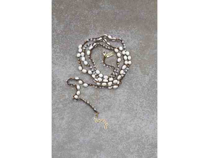 Handcrafted in Brazil, pearls and tiny faceted rainbow moonstone are woven into silk to create this gorgeous convertible piece. At 32" in length and also with an adjustable two-inch 14K gold fill chain closure, the piece converts easily as a statement, layering necklace or as a wrap bracelet.