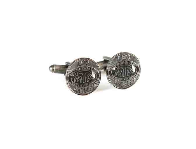 These cufflinks feature vintage 1950s tokens from the Los Angeles County Metropolitan Transportation Authority, now known simply as The Metro to Angelenos. These authentic tokens have been soldered onto pewter bases and given an antique finish.