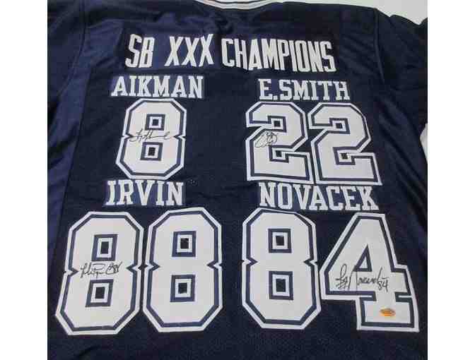Super Bowl XXX Autographed Football Jersey with Troy Aikman, Emmitt Smith, Michael Irvin, and Jay Novacek.