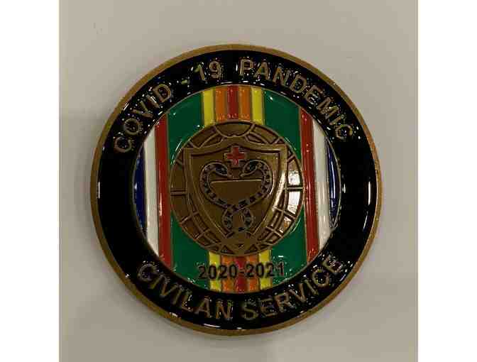 This is the COVID-19 Pandemic Civilian Service Challenge Coin. The back side of the coin has the seal for the Assistant Secretary for Preparedness and Response.