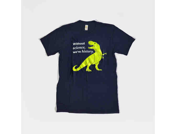 Union of Concerned Scientists "Without Science We Are History" navy blue, organic viscose and cotton dinosaur t-shirt! Size: adult unisex small.