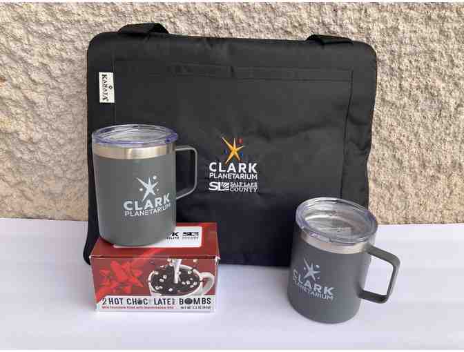 Whether you are gazing at stars, having a picnic, or watching a football game, do it in comfort and style with this package of goodies generously donated by Clark Planetarium in Salt Lake City. Sit on the insulated stadium blanket while drinking the cocoa bomb from one of the two insulated mugs!