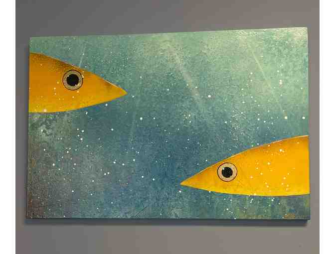 This is Amos Hummel, titled Mellow Yellow. It measures 36"x24"x1" and is enamel on gallery panel. This is a unique painting that belongs with someone who loves fish and the blue water. By looking at it, doesn't it make you want to go sailing in the Caribbean?