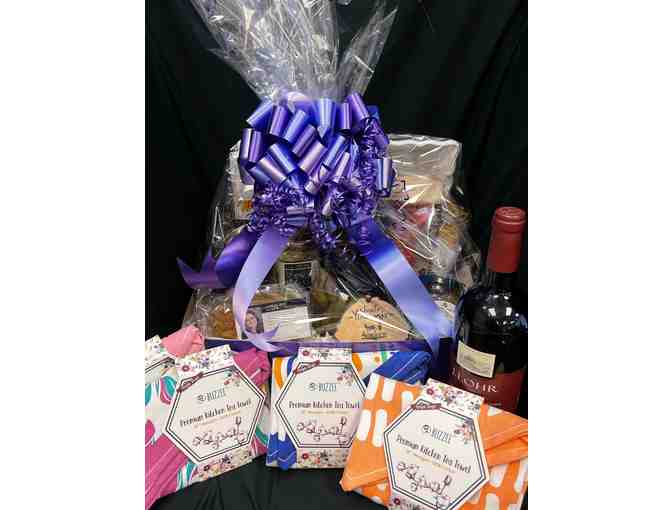 You will look like a gourmet chef with this Charcuterie gift basket. It includes On Boards book: With 52 photos of inspiring boards and 52 simple recipes to share at every gathering, beautiful white square platter, soppressata salami, gourmet crackers, dried apricots, almond stuffed olives, marinated artichokes, gherkins, gourmet butter pretzels, raspberry honey mustard pretzel dip, 4 premium kitchen tea towels, and a bottle of J. Lohr Estates Seven Oaks Cabernet Sauvignon. Enjoy!