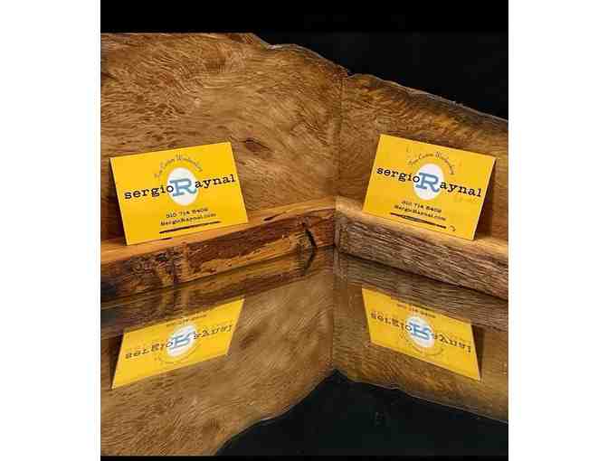 Southeast meets Northwest in this stunning one-of-a-kind mirror by custom furniture designer Sergio Raynal. Framed with live edge Claro Walnut from Northern California, this 28" by 36" mirror is joined by live-edge Live Oak from a local tree that fell during Hurricane Matthew. This bold dimensional piece would look stunning over a buffet or a fireplace -- whether in a mountain retreat or a beach house.